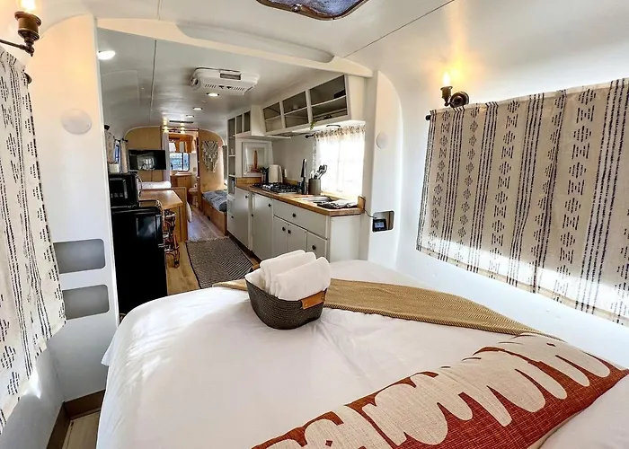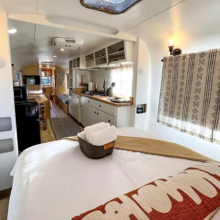 A fully-fitted kitchen with a fridge, a stove top, and kitchenware is included at the villa. Luxe Pet-Friendly Airstream Retreat: Glamping Paradise In Grand Junction, Colorado villa is also a 20-minute drive from Grand Junction Regional airport.
